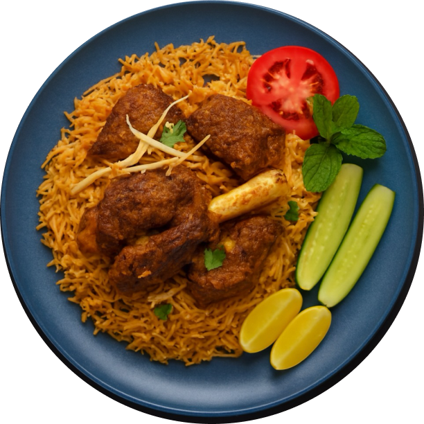 Fragrant basmati rice gently cooked with tender meat and whole spices, delivering delicate aromas, soft textures and a refined, comforting richness in every spoonful.