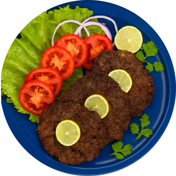 A traditional spiced kebab made from finely minced meat blended with herbs and spices, shallow-fried until crisp on the outside while remaining succulent and flavourful within.