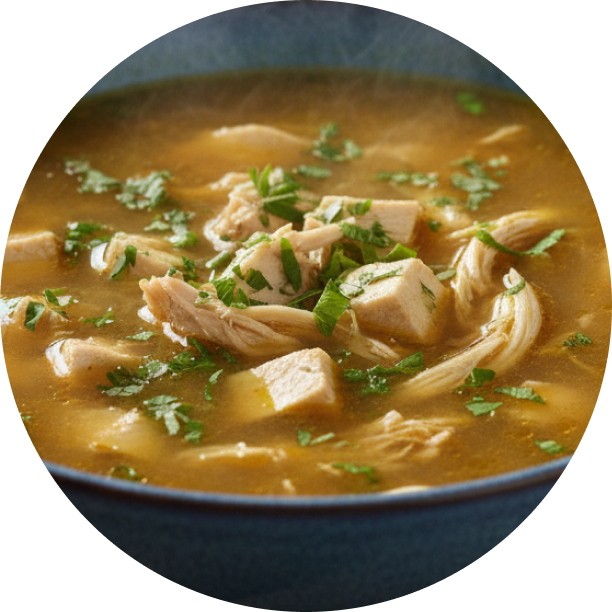 A comforting yet refined soup prepared from tender chicken gently simmered with aromatic vegetables and herbs, creating a clear, flavourful broth that is both nourishing and elegantly balanced.
