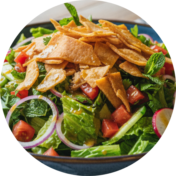 A crisp, refreshing salad of seasonal vegetables tossed with toasted flatbread, sumac and a zesty lemon dressing, delivering bold contrasts of crunch, tang and herbal depth.