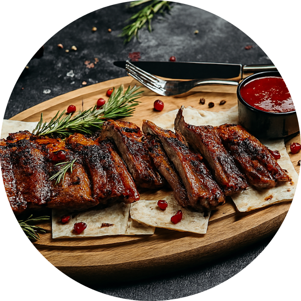 Succulent lamb ribs slow-cooked until tender, finished with a gentle glaze and aromatic seasoning for a deeply flavourful and indulgent experience.