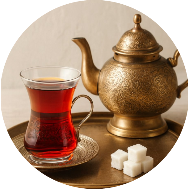 A traditional brew of carefully selected black tea leaves, steeped to achieve a deep amber colour and full-bodied flavour, served in the authentic Turkish style.